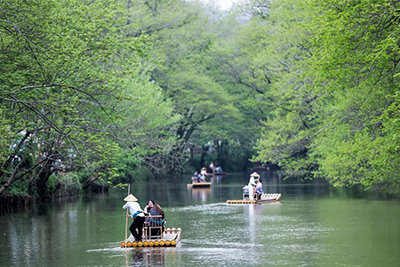 7月23日,中国组合韩贵飞(右三)/张天鑫(右一)在获得男子团体W1级冠军后向观众致意。新华社记者 贺灿铃 摄