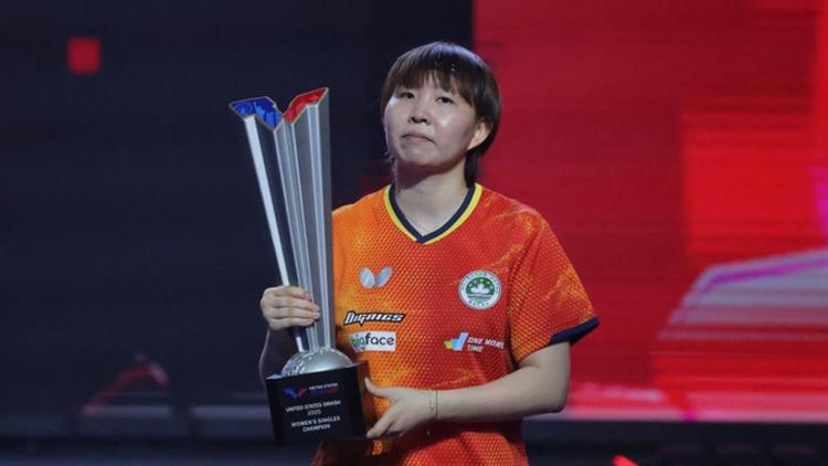 7月13日,冠军朱雨玲在颁奖仪式上。当日,在美国拉斯维加斯举行的世界乒乓球职业大联盟(WTT)美国乒乓球大满贯女子单打决赛中,中国澳门队选手朱雨玲4:2战胜中国队选手陈熠,夺得冠军。新华社发(邱晨摄)