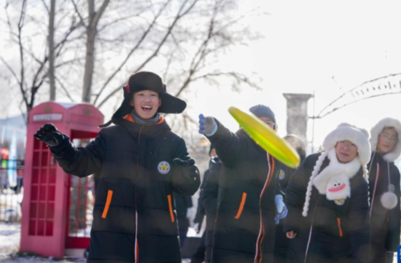 12月3日,吉林市第一实验小学学生在吉林市纳美山谷度假区体验雪地飞盘。