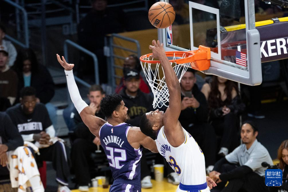 12月28日,湖人队球员八村塁(右)在比赛中上篮受阻。