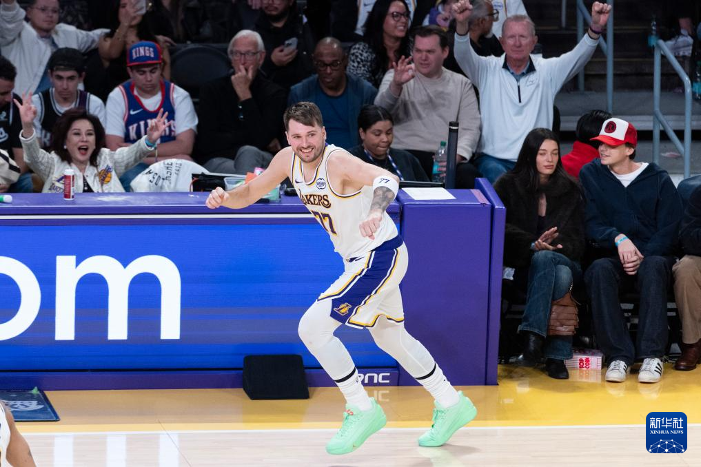 12月28日,湖人队球员卢卡·东契奇在比赛中庆祝投入三分球。
