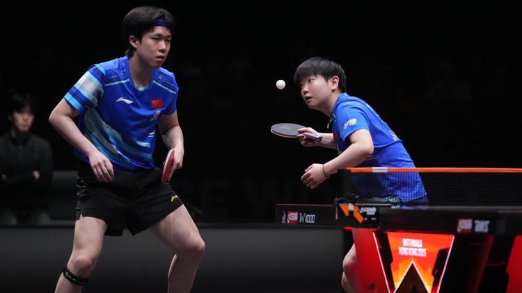 2025年12月13日,王楚钦/孙颖莎(右)在2025年世界乒乓球职业大联盟(WTT)总决赛混双决赛中。新华社发(吕小炜摄)