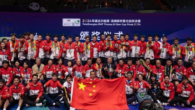 ↑2024年5月5日,中国男、女羽毛球队在成都举行的汤姆斯杯暨尤伯杯决赛中均战胜印度尼西亚队,夺得队史第11座汤姆斯杯和第16座尤伯杯,时隔12年再度包揽汤尤杯