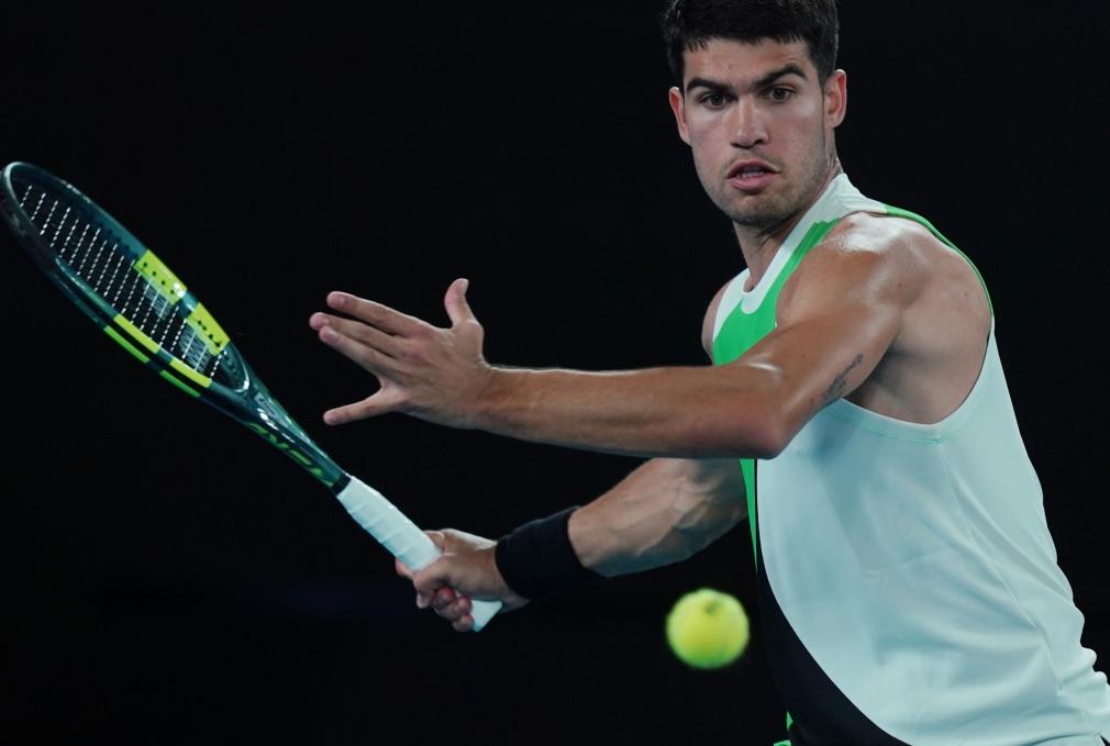1月18日,阿尔卡拉斯在比赛中回球。新华社发(王申摄)