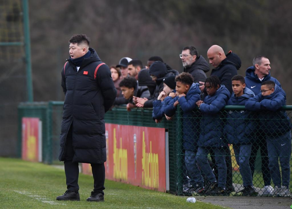 1月17日,中国犀旺队主教练崔鹏(左一)在法国足协“希望挑战赛”中观战。新华社记者 贺灿铃 摄