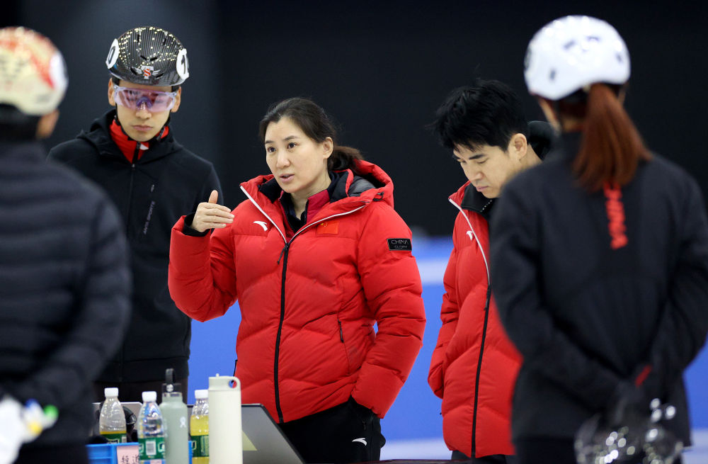 1月29日,中国短道速滑队教练张晶(中)布置训练任务。新华社记者 张晨 摄