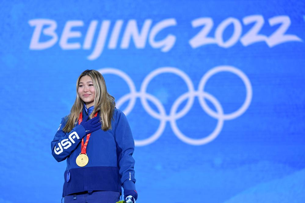 2022年2月10日,冠军美国选手克洛伊·金在北京2022年冬奥会单板滑雪女子U型场地技巧奖牌颁发仪式上。新华社记者 戴天放摄