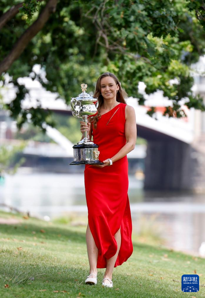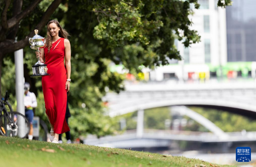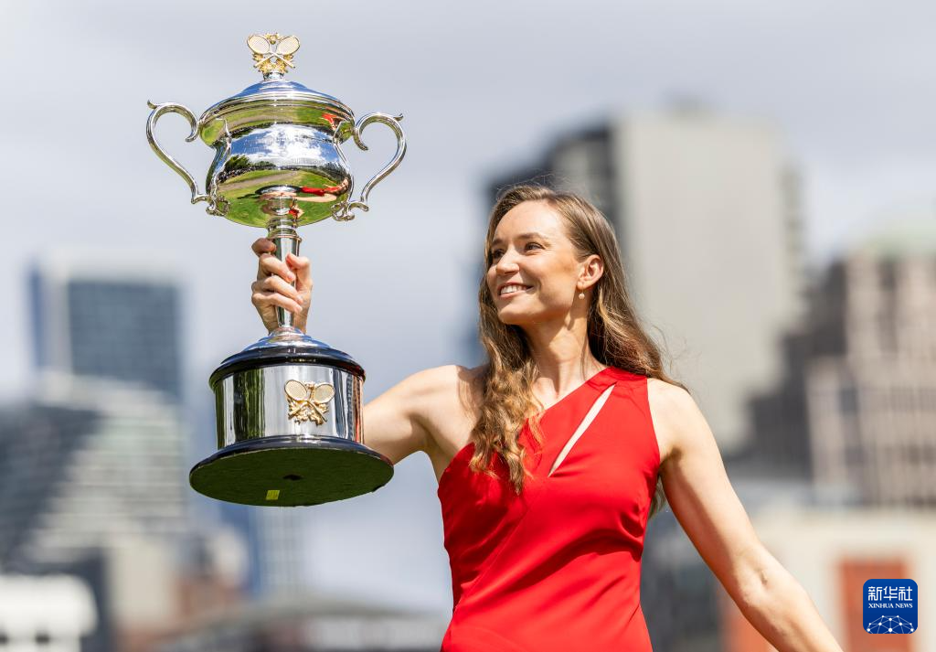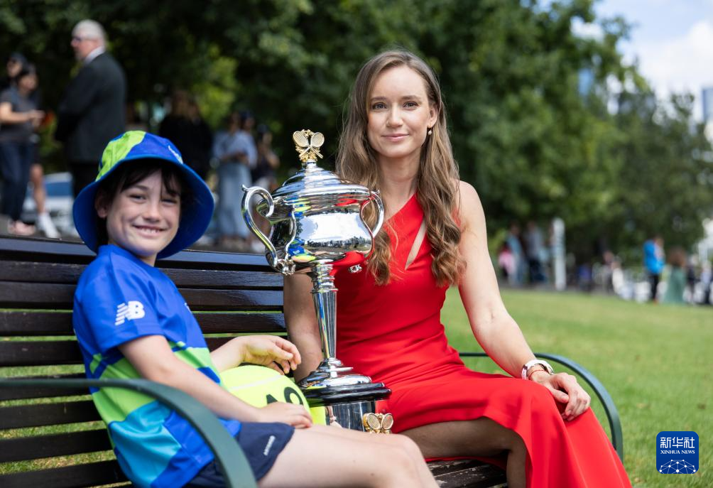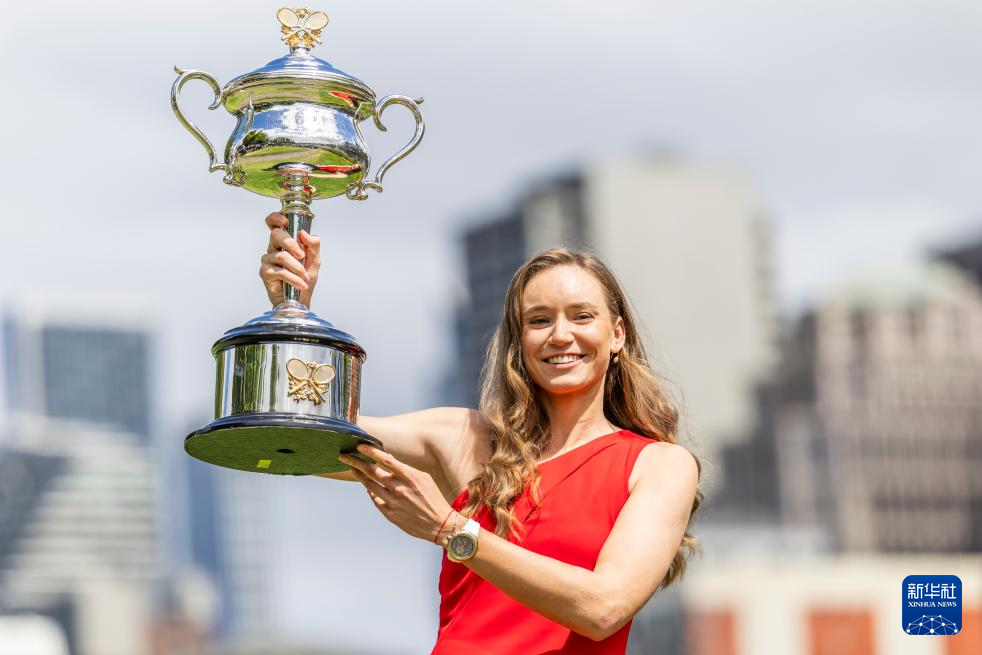当地时间2月1日,2026年澳大利亚网球公开赛女子单打冠军、哈萨克斯坦选手莱巴金娜在墨尔本雅拉河畔展示冠军奖杯。