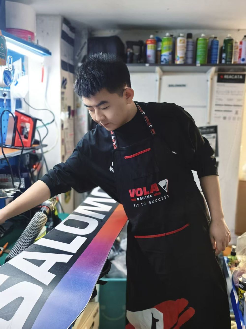 米嘉轩在雪具店内工作。受访者供图