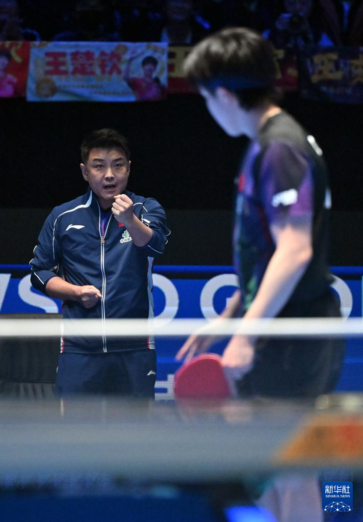 2月8日,教练王皓(左)在比赛中与王楚钦交流。