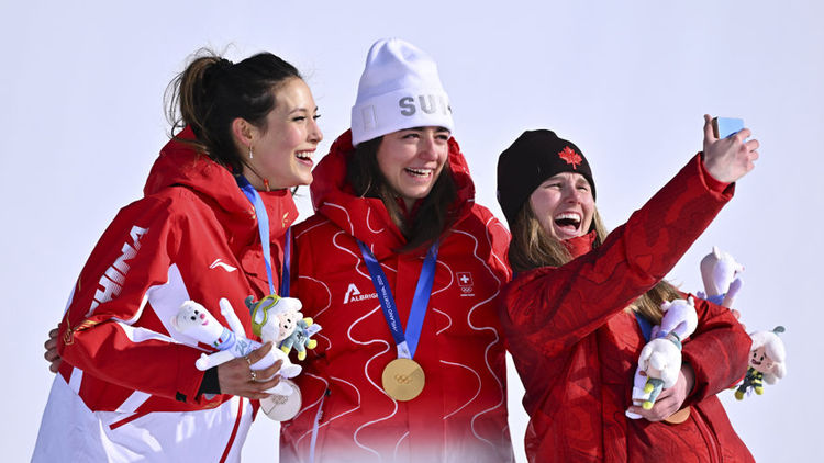 2月9日的自由式滑雪女子坡面障碍技巧决赛赛后,亚军中国选手谷爱凌(左)和冠军瑞士选手玛蒂尔德·格雷莫德(中)、季军加拿大选手奥尔德姆在领奖台上合影。新华社记者张宏祥 摄