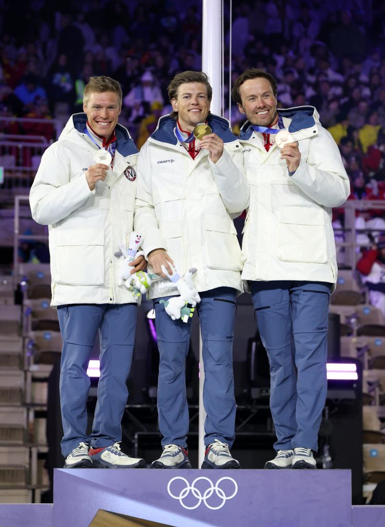 2月22日,越野滑雪男子50公里集体出发(传统技术)冠军挪威选手克莱博(中)、亚军挪威选手尼格特(左)和季军挪威选手伊韦尔森在闭幕式现场举行的颁奖仪式上。新华社记者李明 摄