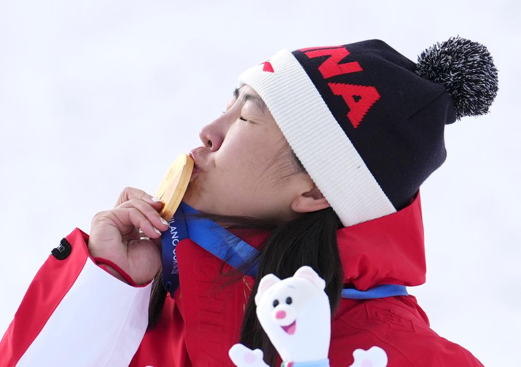 2月18日,中国选手徐梦桃在颁奖仪式上亲吻金牌。新华社记者胡超 摄