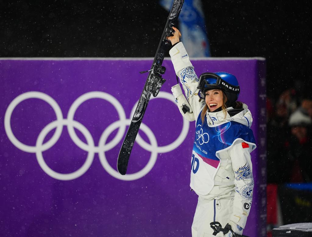 2月16日,中国选手谷爱凌在比赛后庆祝。新华社记者 胡超摄