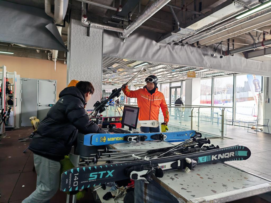 夹谷关滑雪场中,滑雪爱好者正在租雪具。新华社记者 张武岳摄