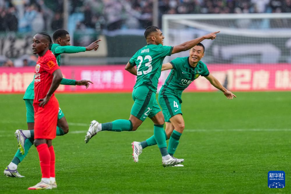 3月1日,北京国安队球员达万(右二)在比赛中庆祝进球。
