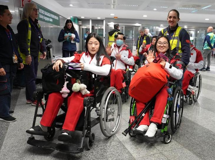 2月28日,米兰冬残奥会中国体育代表团成员抵达意大利米兰马尔彭萨机场。新华社记者 才扬摄