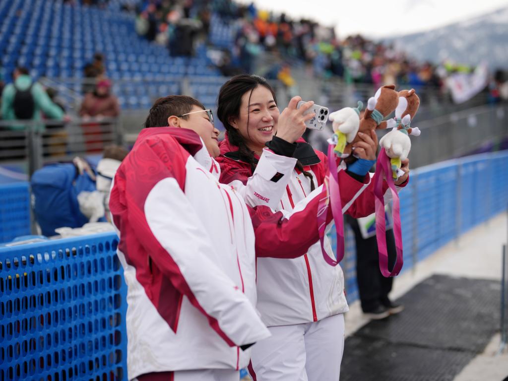 3月10日,朱文静(左)、刘思彤给手中的奖牌与吉祥物拍照。新华社记者 郑直 摄