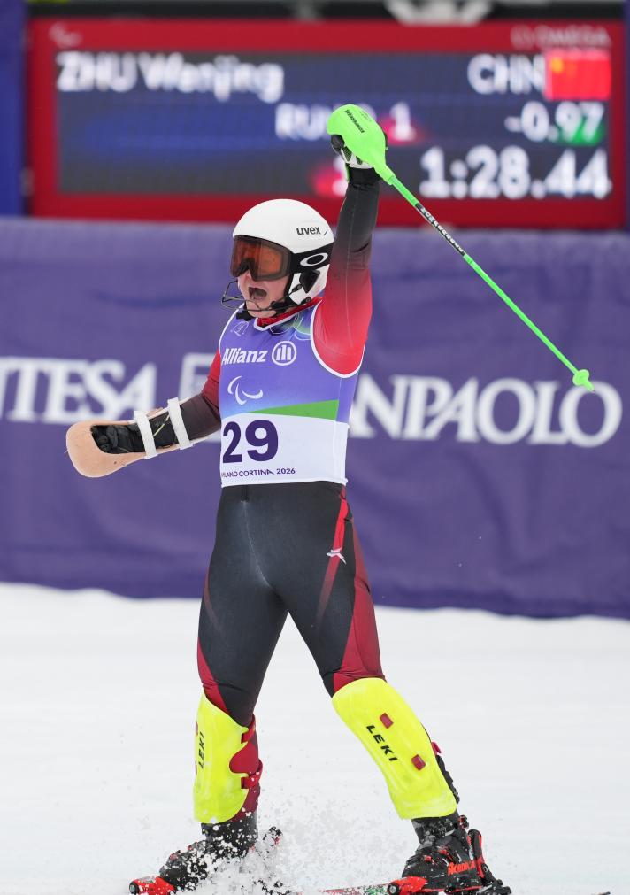 3月14日,米兰-科尔蒂纳冬残奥会高山滑雪女子回转(站姿)比赛在意大利科尔蒂纳举行。中国选手朱文静获得亚军。新华社记者王楷焱 摄