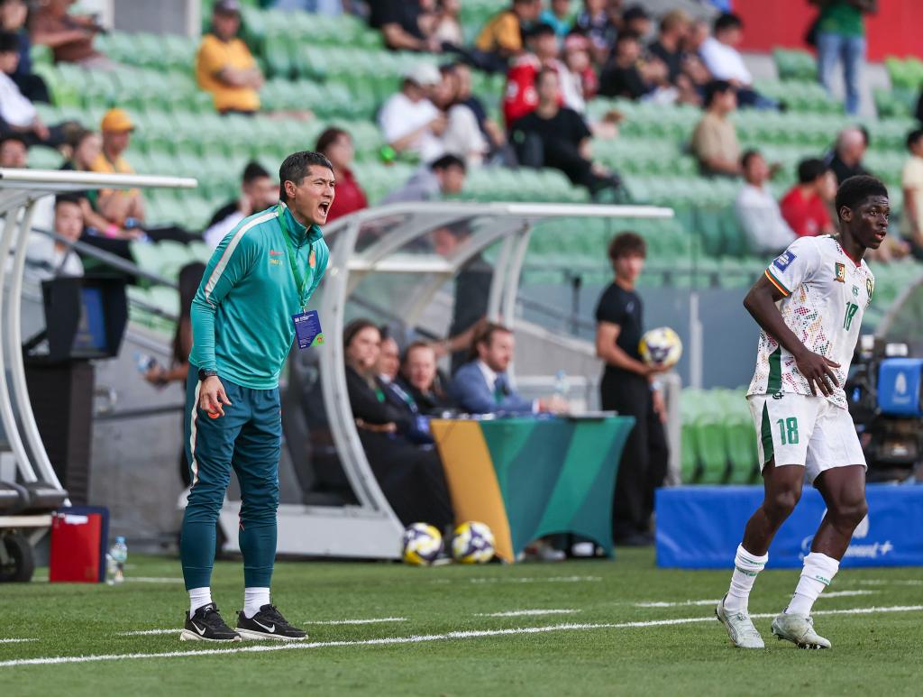 3月31日,中国队主教练邵佳一(左)在场边指挥。新华社发(舒泽林摄)