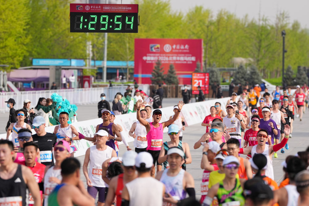 4月12日,2026北京半程马拉松参赛选手通过终点。新华社记者鞠焕宗 摄