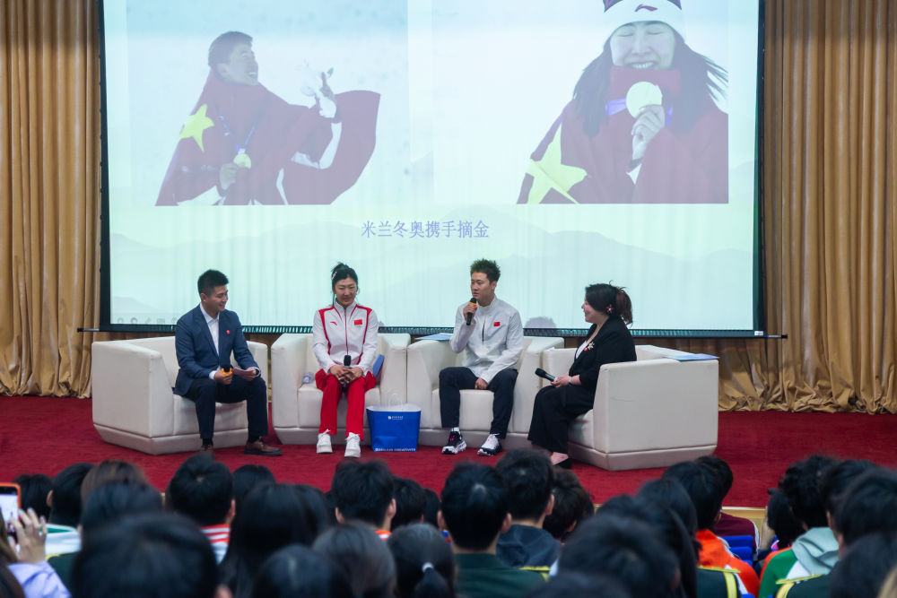 她向在场学生分享了自己的一个小故事:“2010年的时候我们在北京体育大学备战冬奥会,我们每个人写一句非常鼓劲儿的话,大家都是匿名写的,从中间抽一句票数最多的就打上横幅,挂到训练基地里。最后选中了我的那句话,就是‘成功与失败之间的差距只在于最后的一点坚持’,一直挂了四年多。”