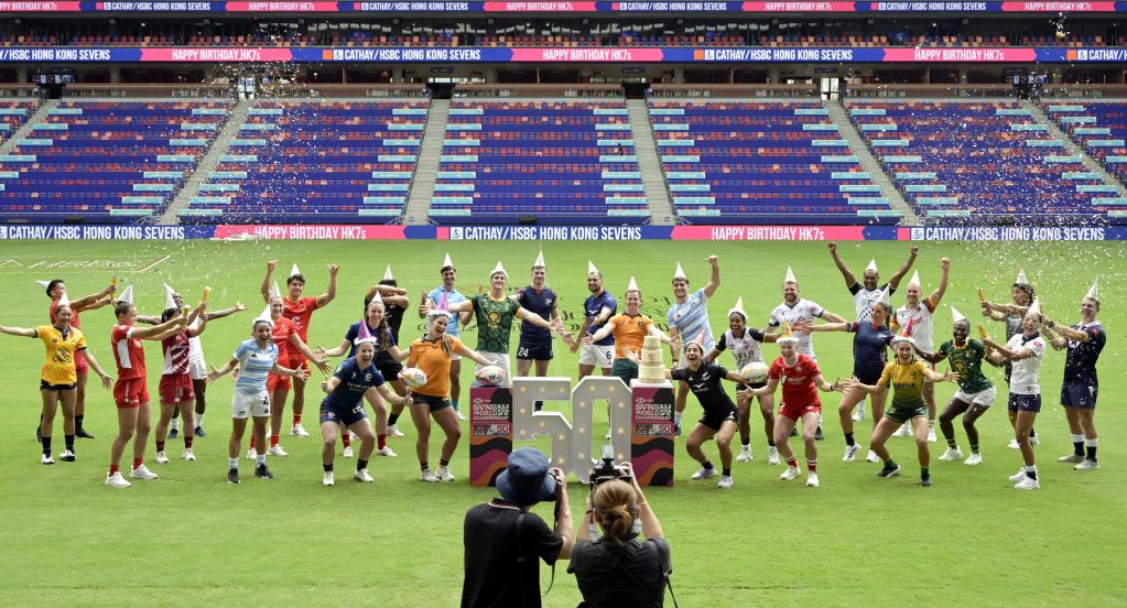 4月15日,参加香港国际七人橄榄球赛的各队队长合影,庆祝该赛事迎来50周年。新华社发(卢炳辉摄)