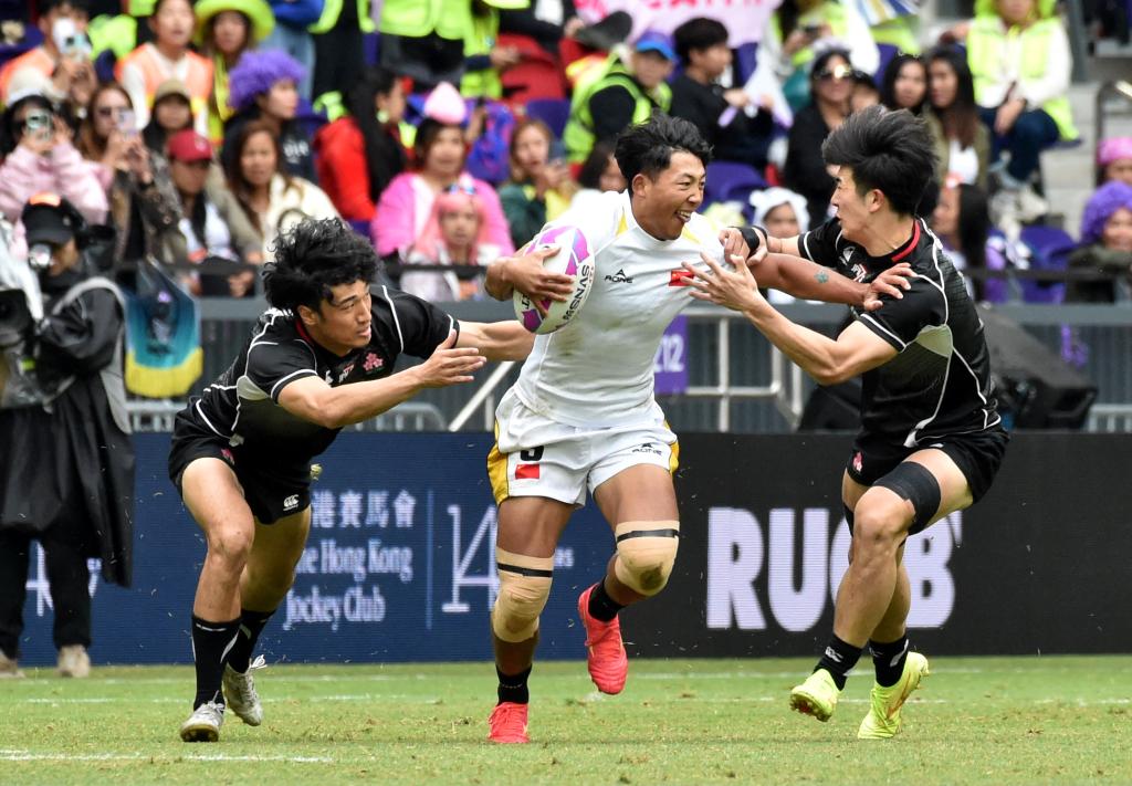 4月19日,中国队球员黄奥琦(中)在比赛中进攻。当日,香港国际七人橄榄球赛在启德体育园主场馆举行,在男子组银剑赛中,中国队0比19不敌日本队。新华社发(卢炳辉摄)