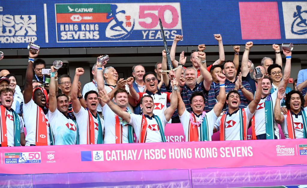 4月19日,中国香港队球员在颁奖仪式上庆祝。当日,在香港启德体育园主场馆举行的香港国际七人橄榄球赛男子组银剑赛决赛中,中国香港队19比15战胜日本队,获得冠军。新华社发(卢炳辉摄)