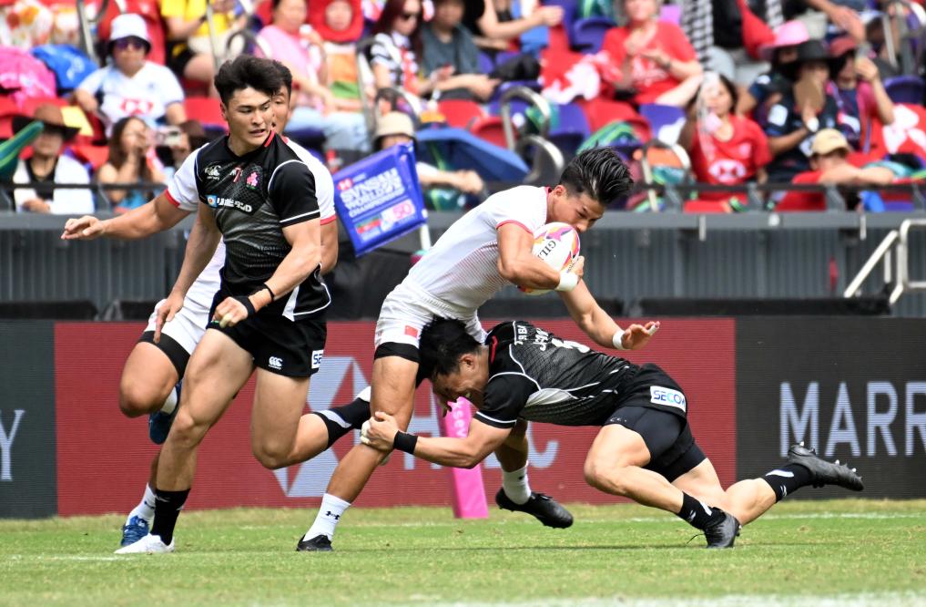 2025年3月30日,中国队球员孙志辉(中)在比赛中进攻。当日,在启德体育园主场馆举行的香港国际七人橄榄球赛男子“银剑赛”中,中国队19比7战胜日本队。新华社发(卢炳辉摄)