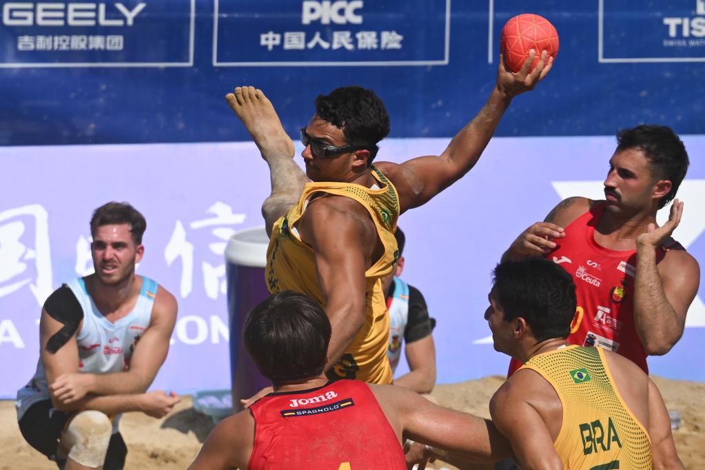 2025年8月12日,巴西队球员贡萨尔维斯(中上)在成都世运会沙滩手球男子铜牌赛中进攻。新华社记者 陈振海 摄