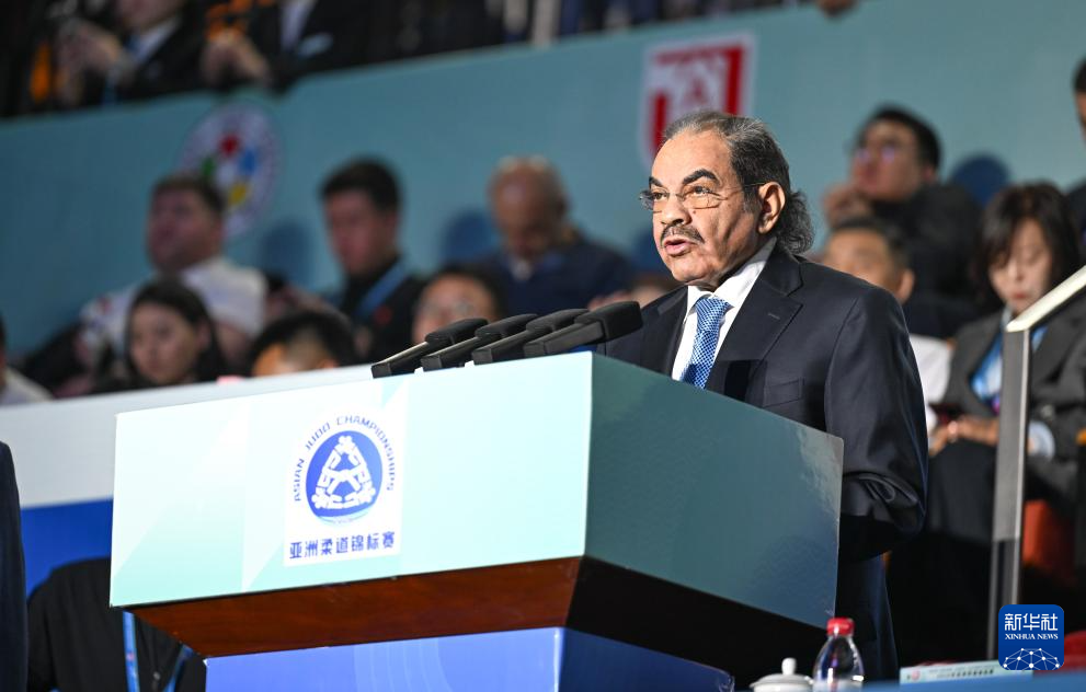 4月16日,亚洲柔道联合会主席欧拜德·安齐在开幕式上讲话。