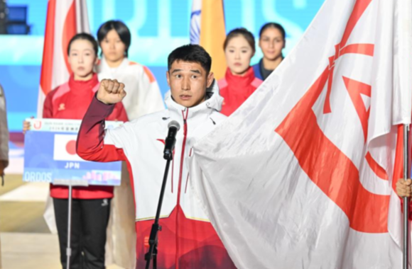 4月16日,中国国家柔道队运动员布和毕力格在开幕式上代表全体参赛运动员宣誓。