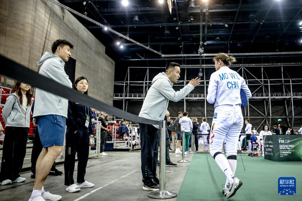 4月17日,中国选手莫婉琳(右)在女子重剑资格赛间隙接受教练指导。
