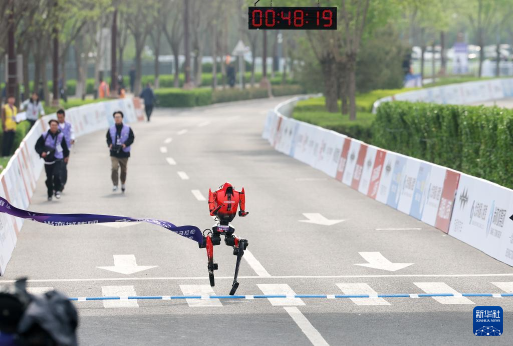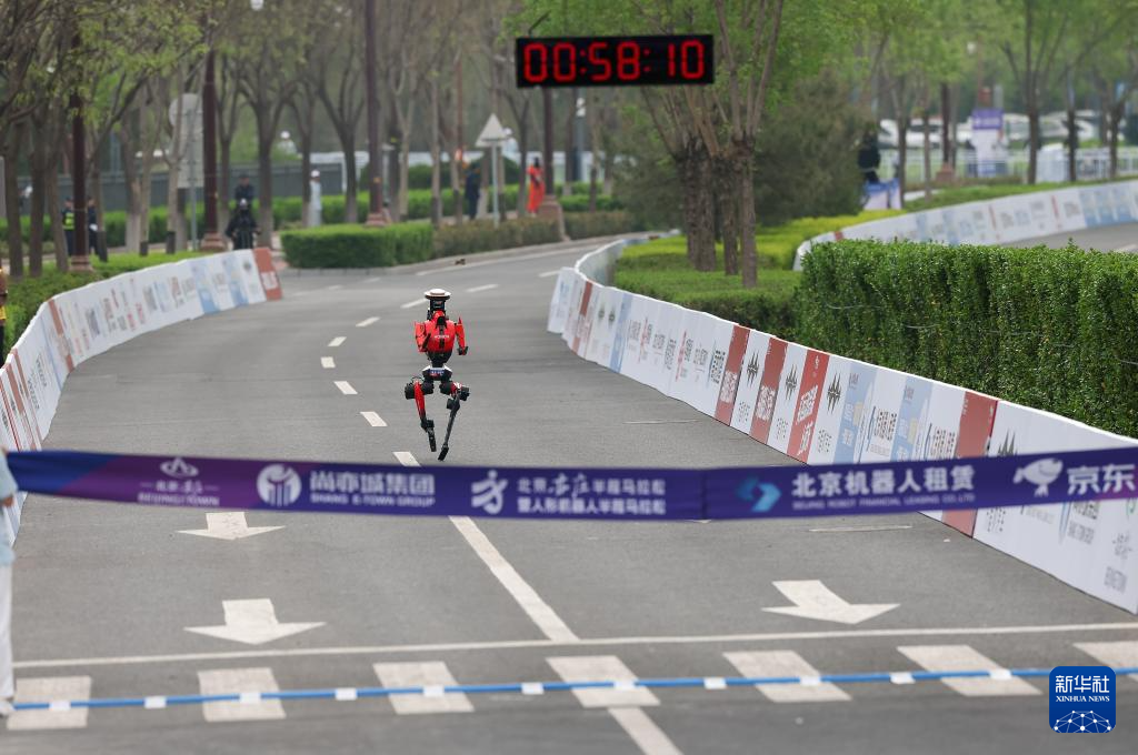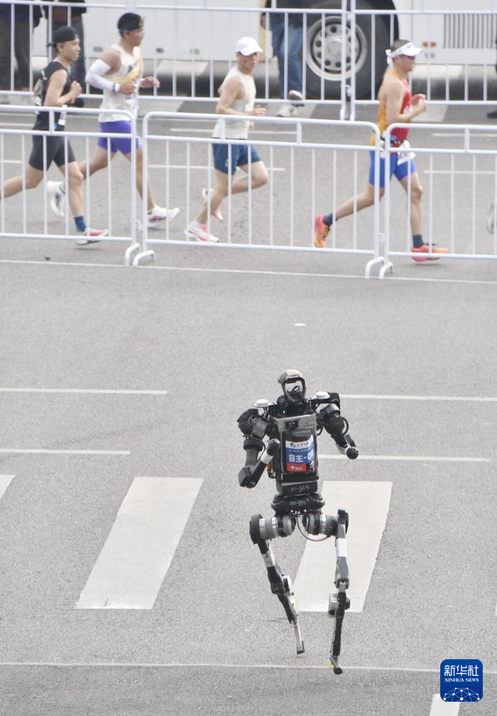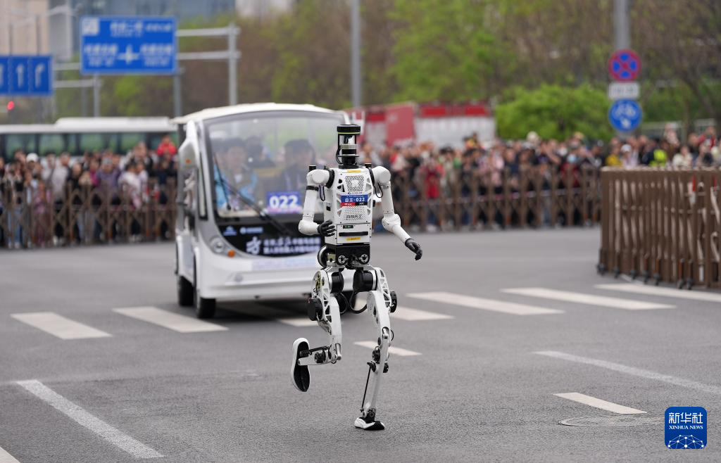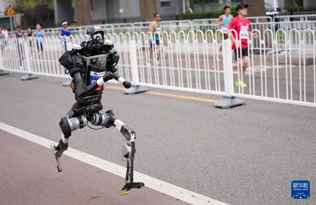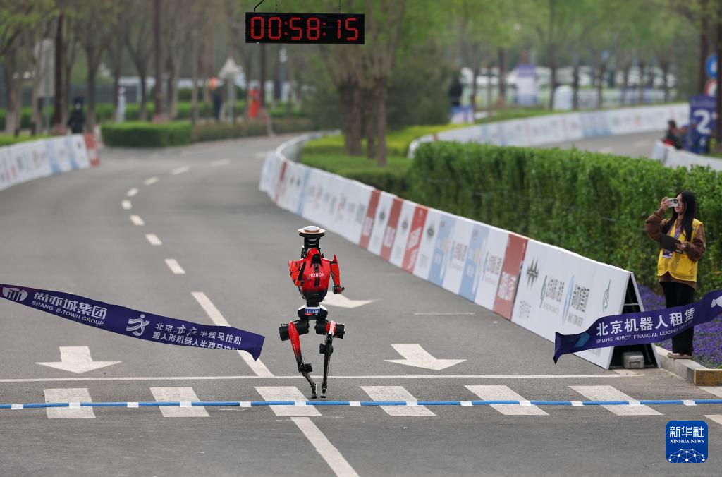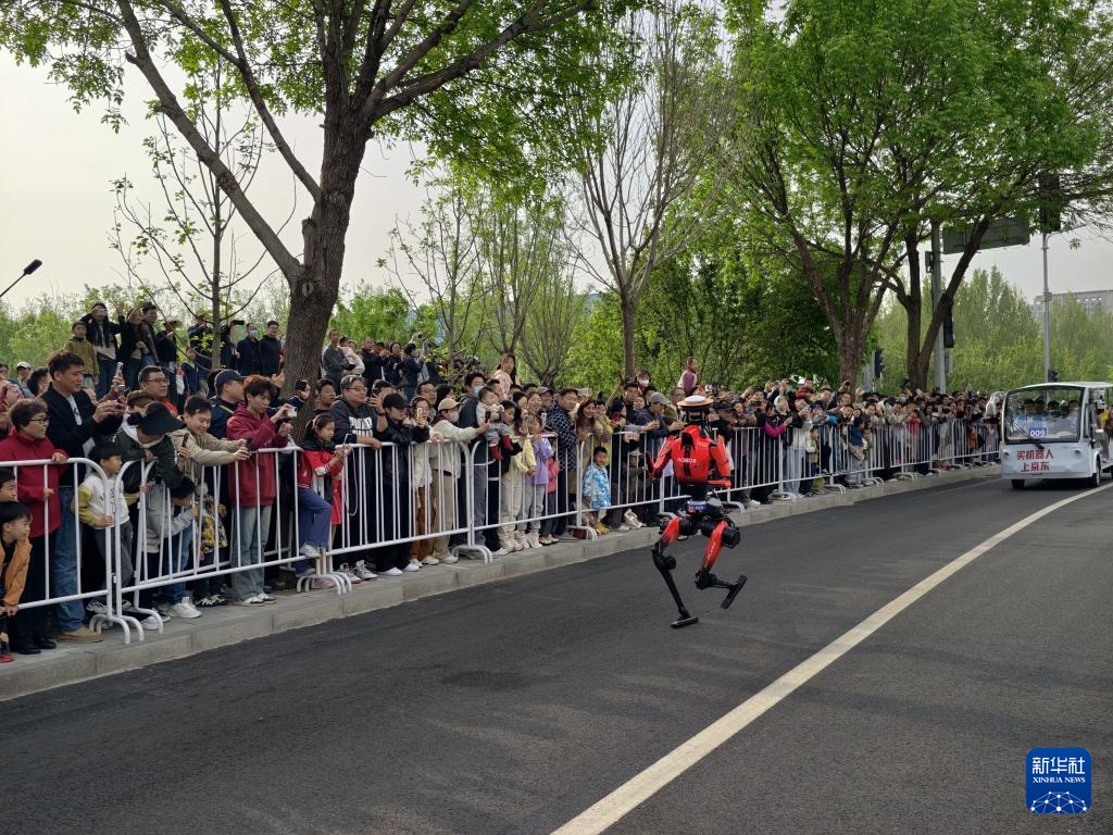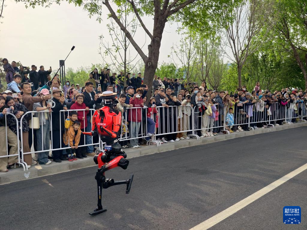 4月19日,杭Y赛队自主人形机器人选手宇树H1在比赛中冲线。