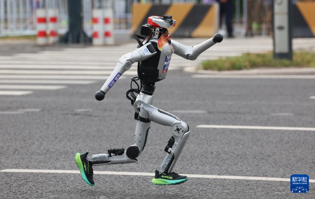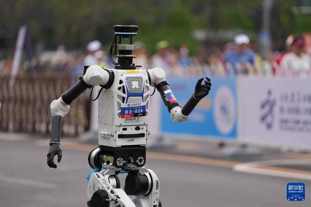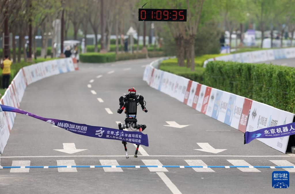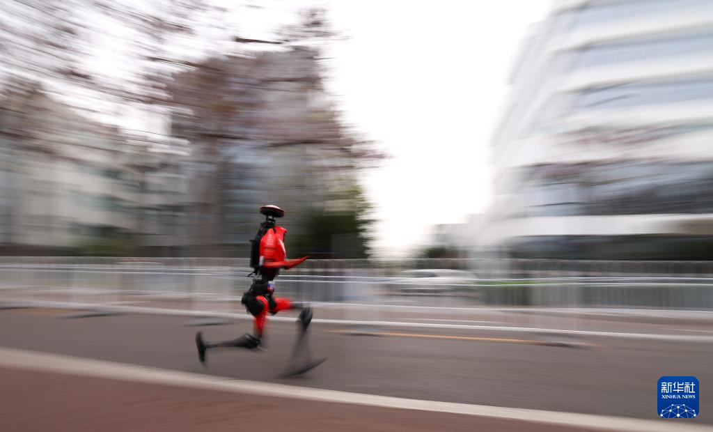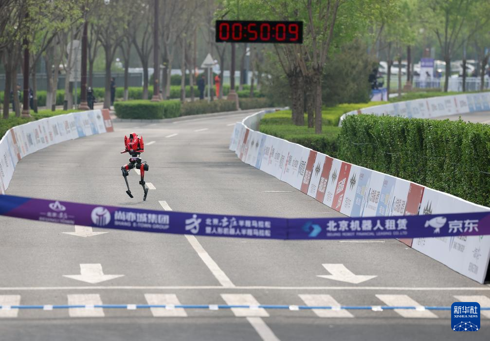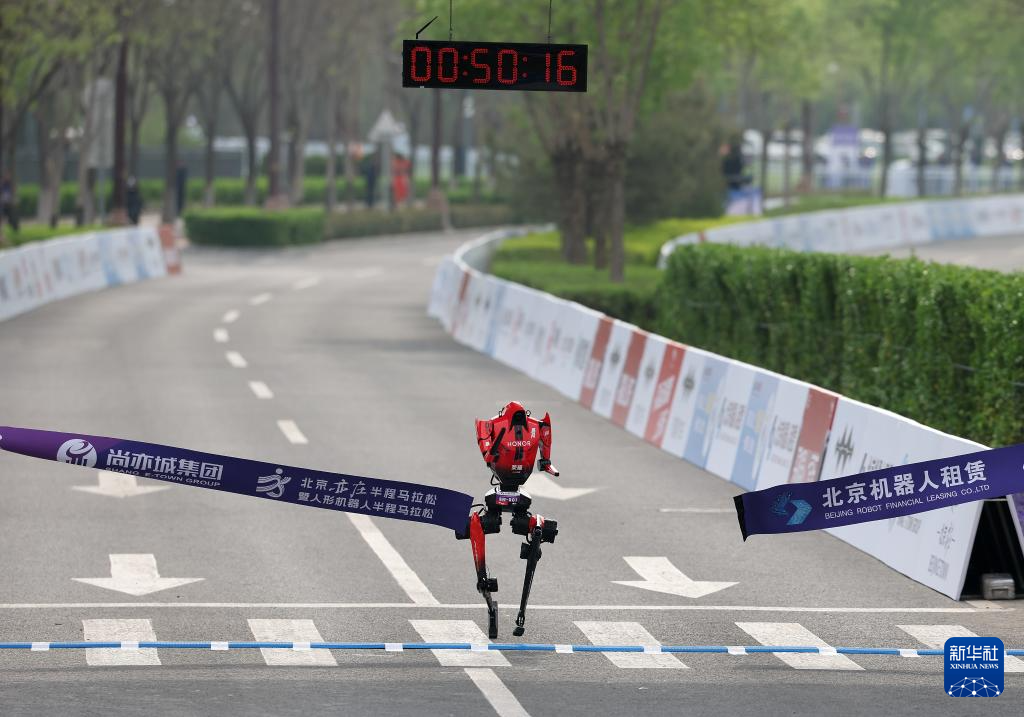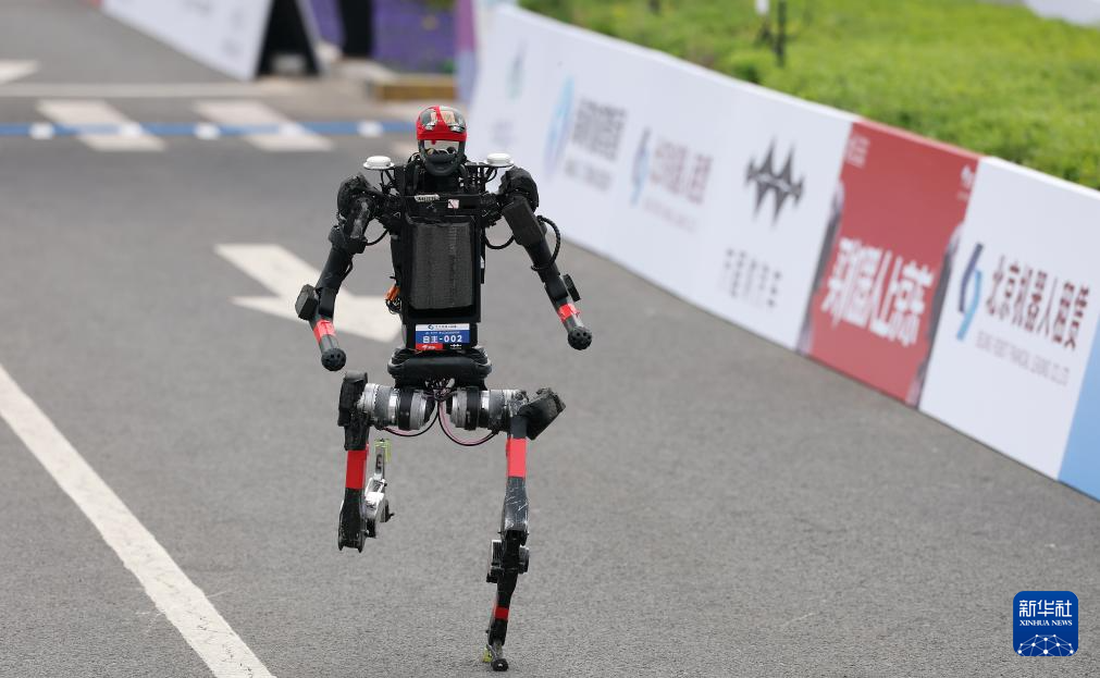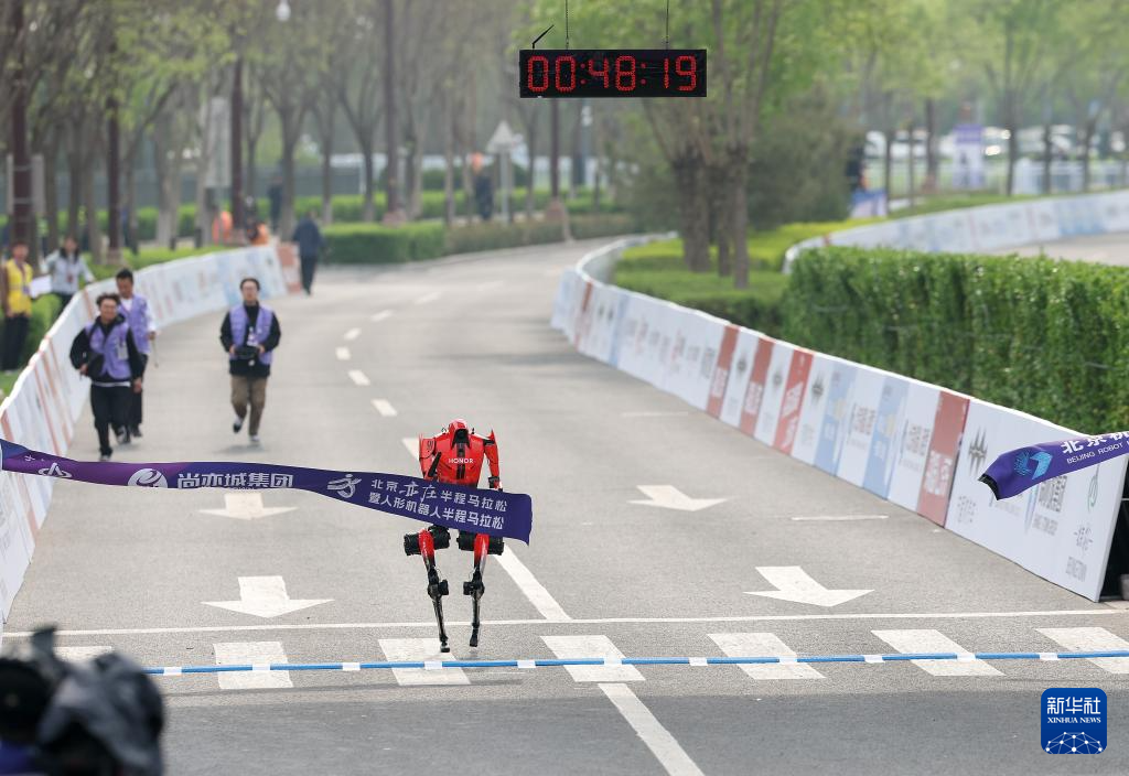 4月19日,杭Y赛队自主人形机器人选手宇树H1在比赛中冲线。