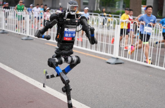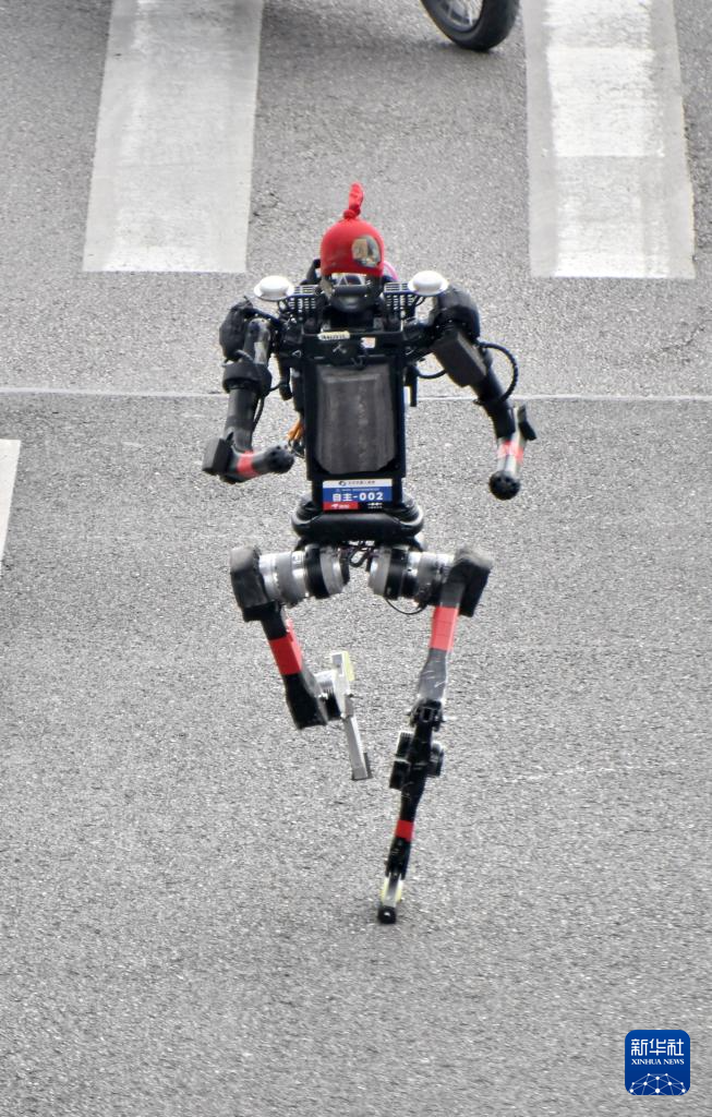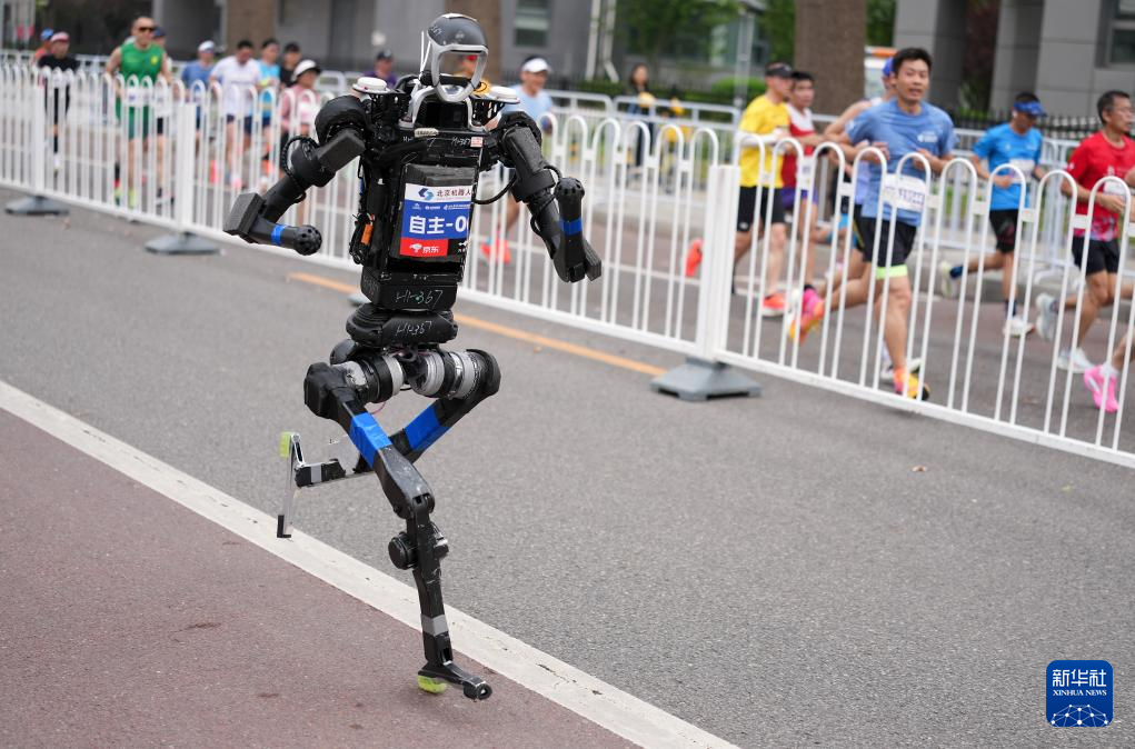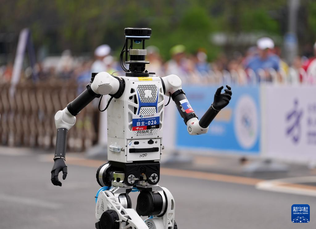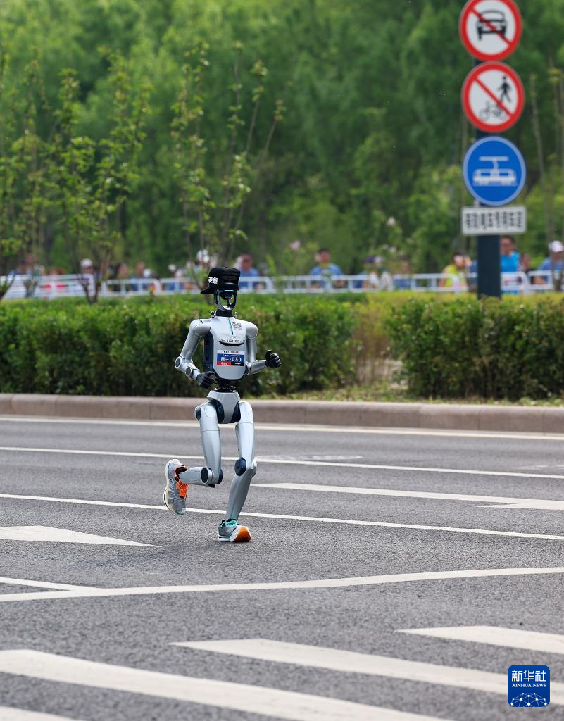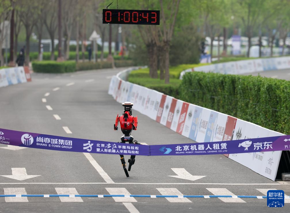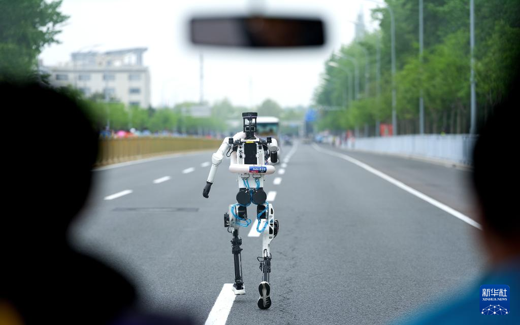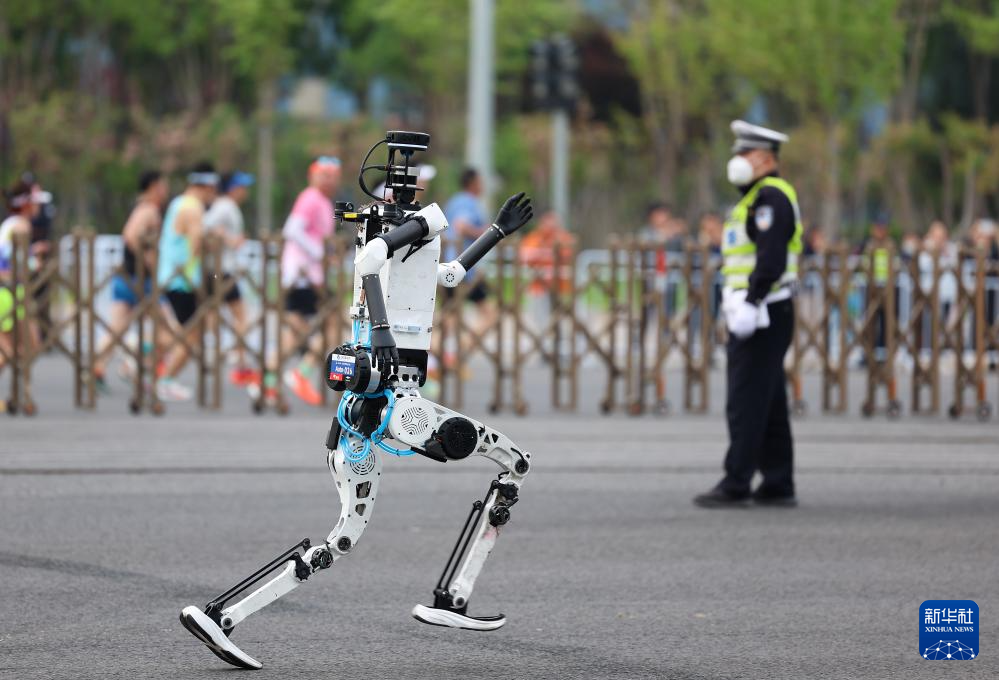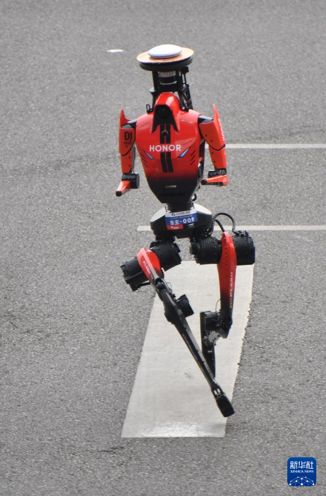4月19日,杭Y赛队自主人形机器人选手宇树H1在比赛中冲线。