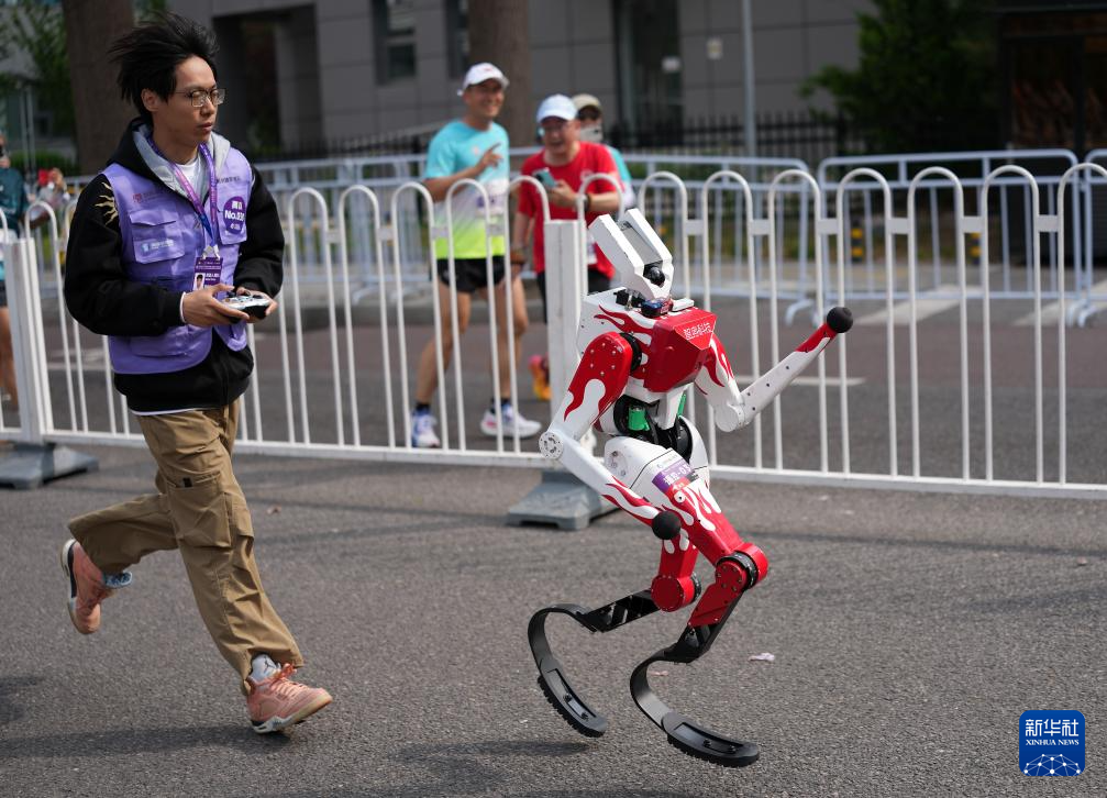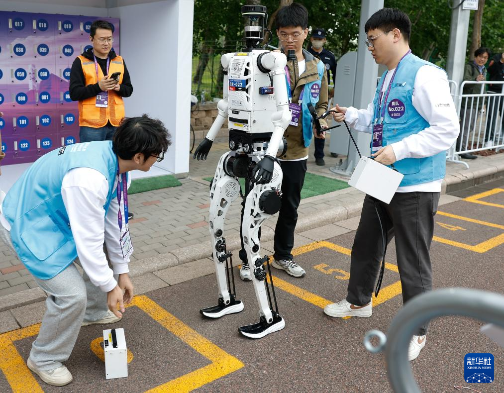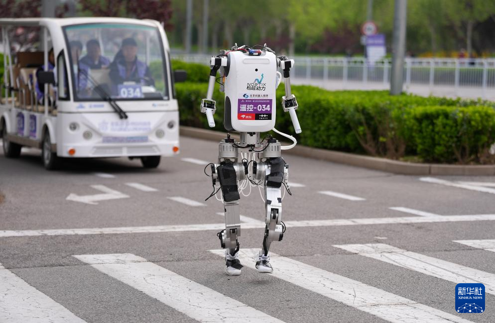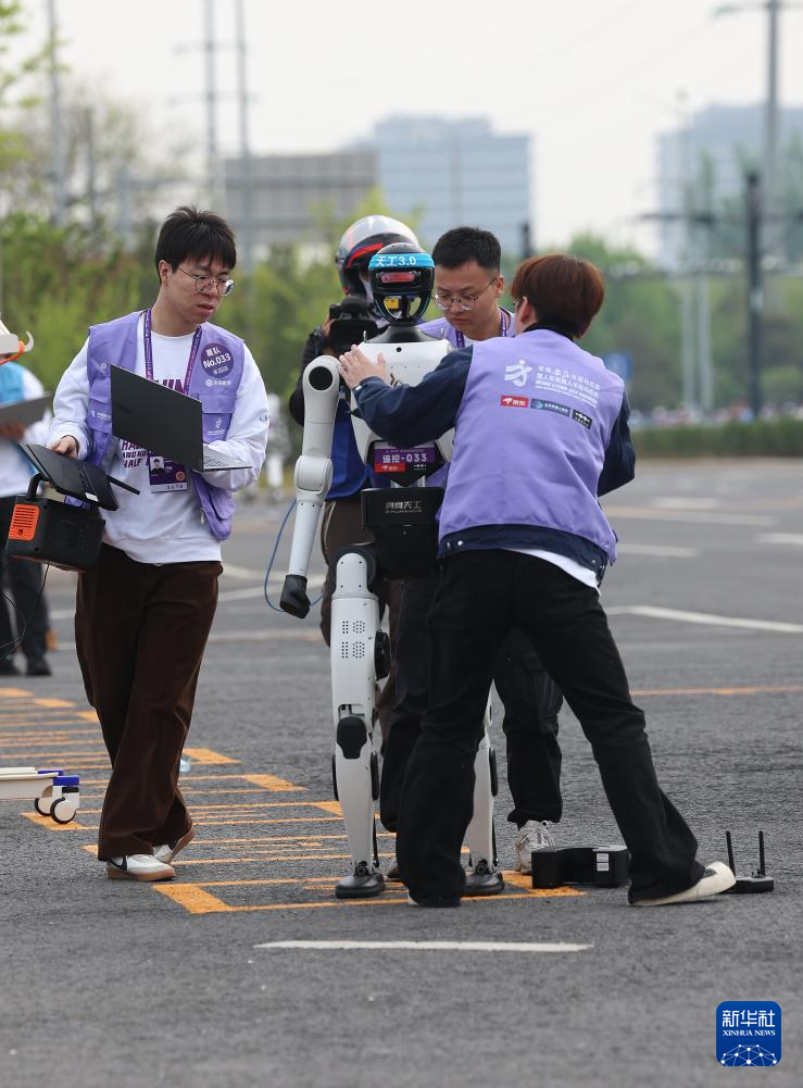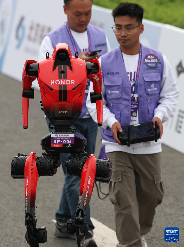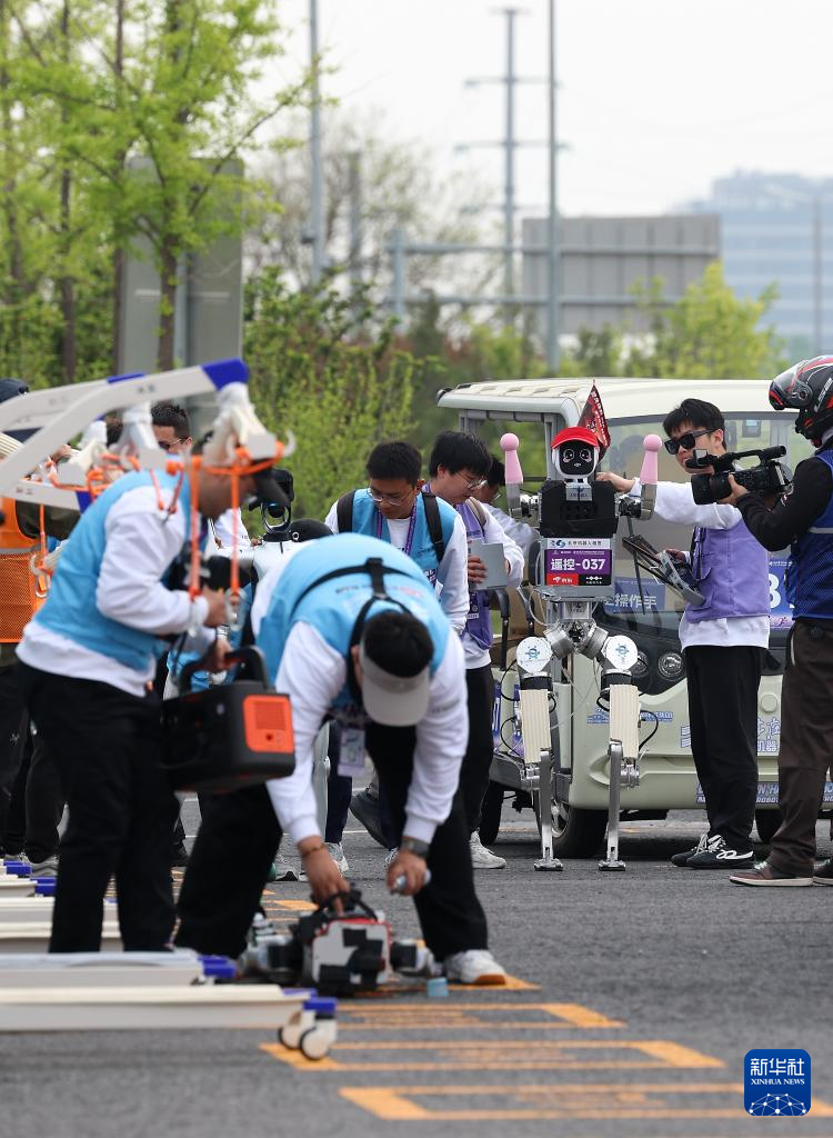 4月19日,智跑者队遥控人形机器人选手天工3.0(左二)在比赛中。
