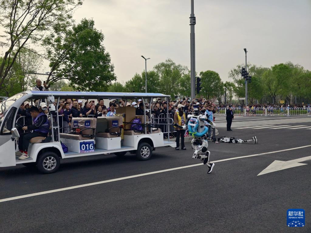 4月19日,天啸队自主人形机器人选手天工Ultra-2026(前右二)在比赛中摔倒。