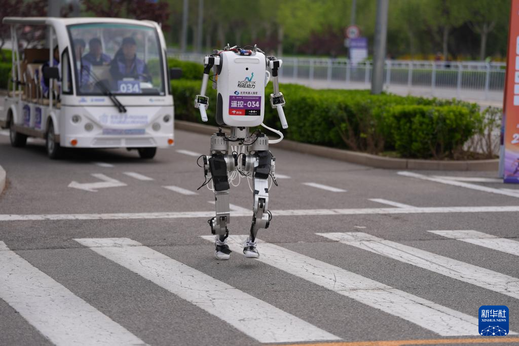 4月19日,元气仔自主奔行队自主人形机器人选手元气仔(中)在比赛中。