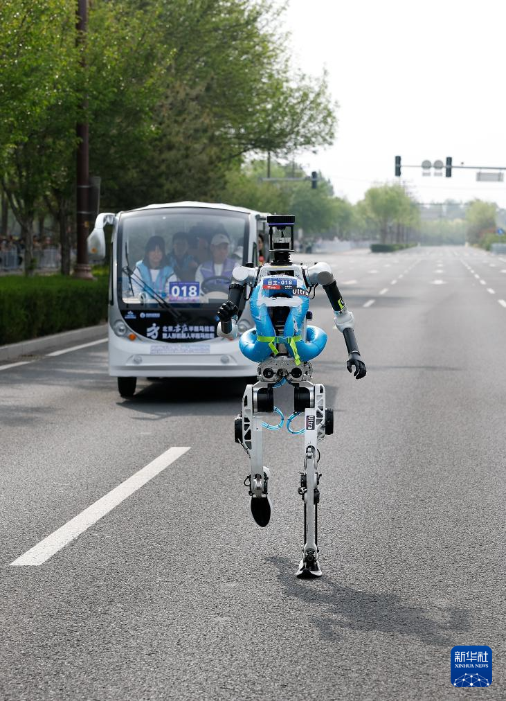 4月19日,天翼队自主人形机器人选手天工Ultra-2025(左前)在比赛中。