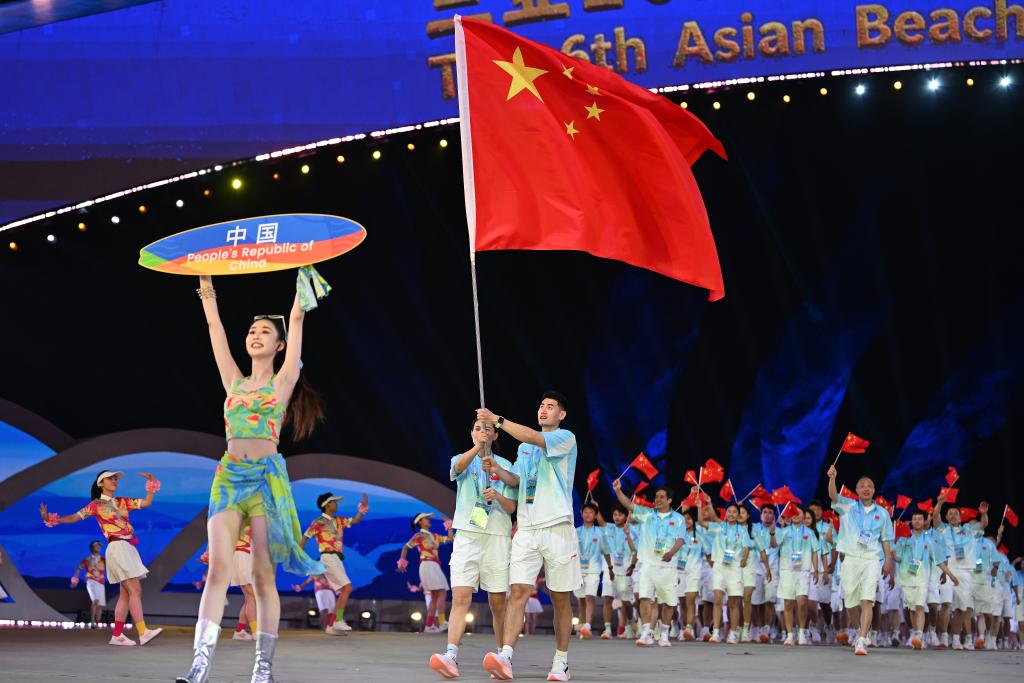 耀眼“中国红”来了!沙滩手球运动员沈萍和三人篮球运动员颜鹏带领中国体育代表团入场。此次中国代表团共派出255人,包括171名运动员,将参加除沙滩卡巴迪外13个大项、60个小项的比赛,是我国参加亚沙会以来参赛率最高的一届。