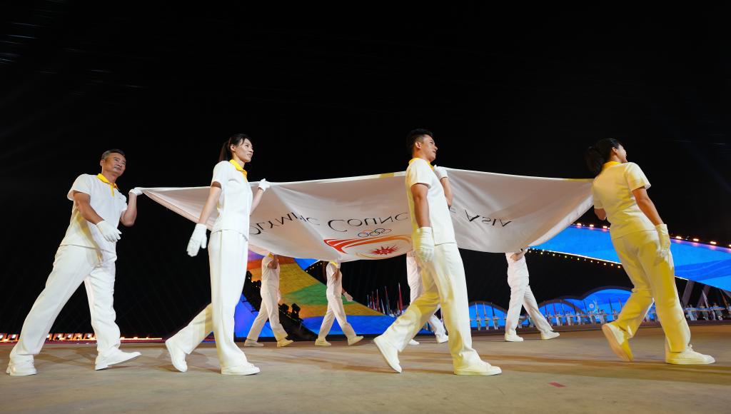 跳水奥运冠军李娜等8人执亚奥理事会会旗入场。亚奥理事会会歌奏响,会旗缓缓升起。