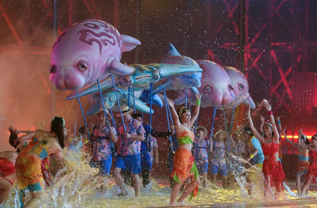 全场灯光转为梦幻的深蓝色,巨型水母在空中漂移,儒艮、鲸鲨、海龟游弋于观众席。潜水员海底探秘,与红珊瑚翩然共舞。此刻,蔚蓝同脉,万物共生——光影交织的海底世界里,流淌着人与自然和谐相处的哲学智慧。