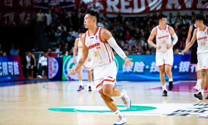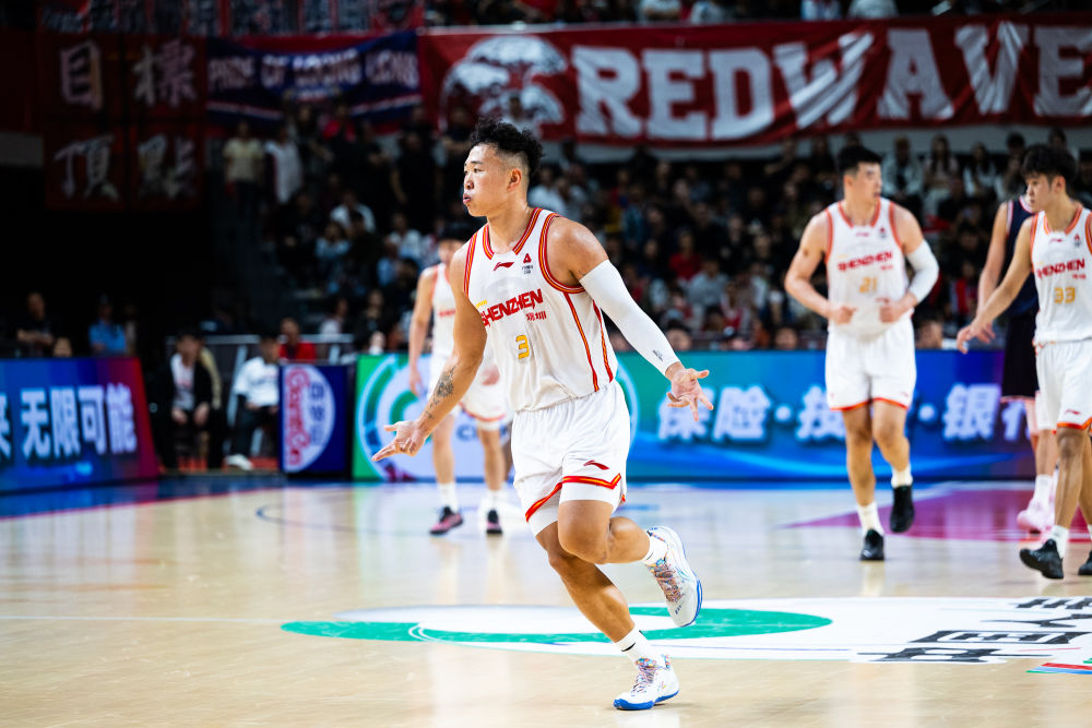 4月24日,深圳队球员贺希宁(左)在命中关键三分球后庆祝。新华社发(华野摄)